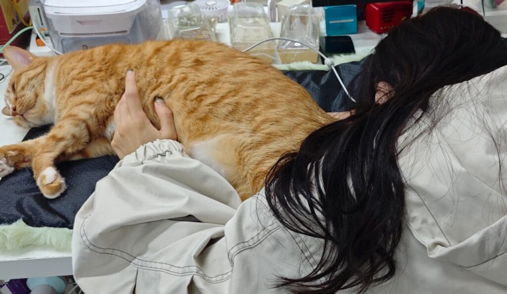 Sleeping with a cat can help us fall asleep faster and have more sweet dreams. Holding a cat’s soft, furry body is like holding a stuffed animal as a child, making us feel relaxed and grounded.